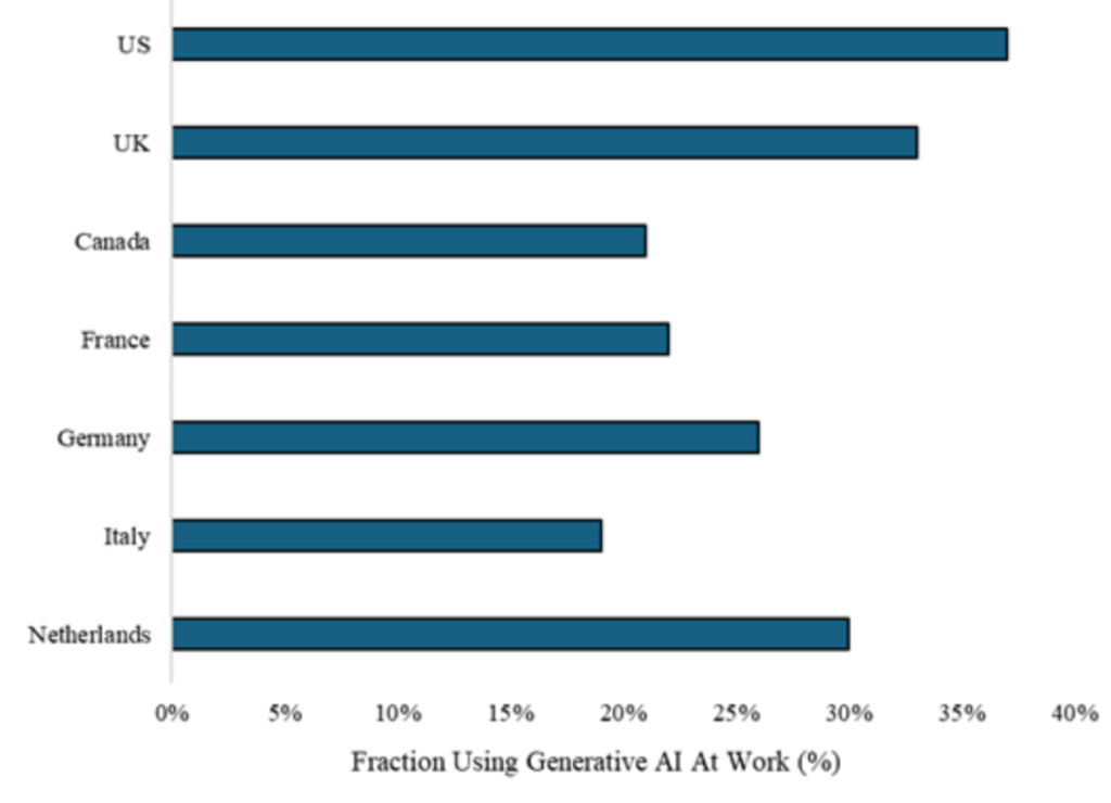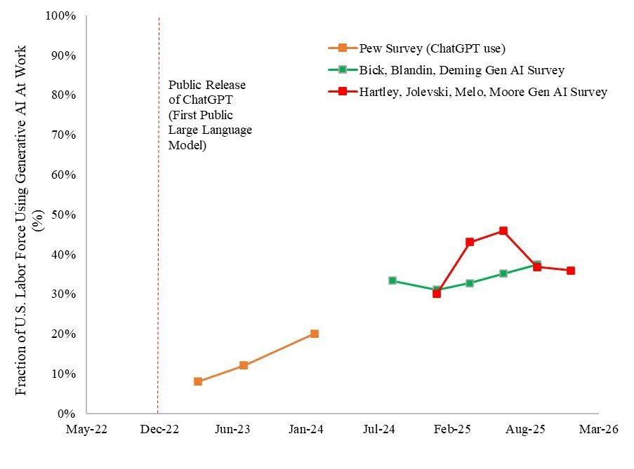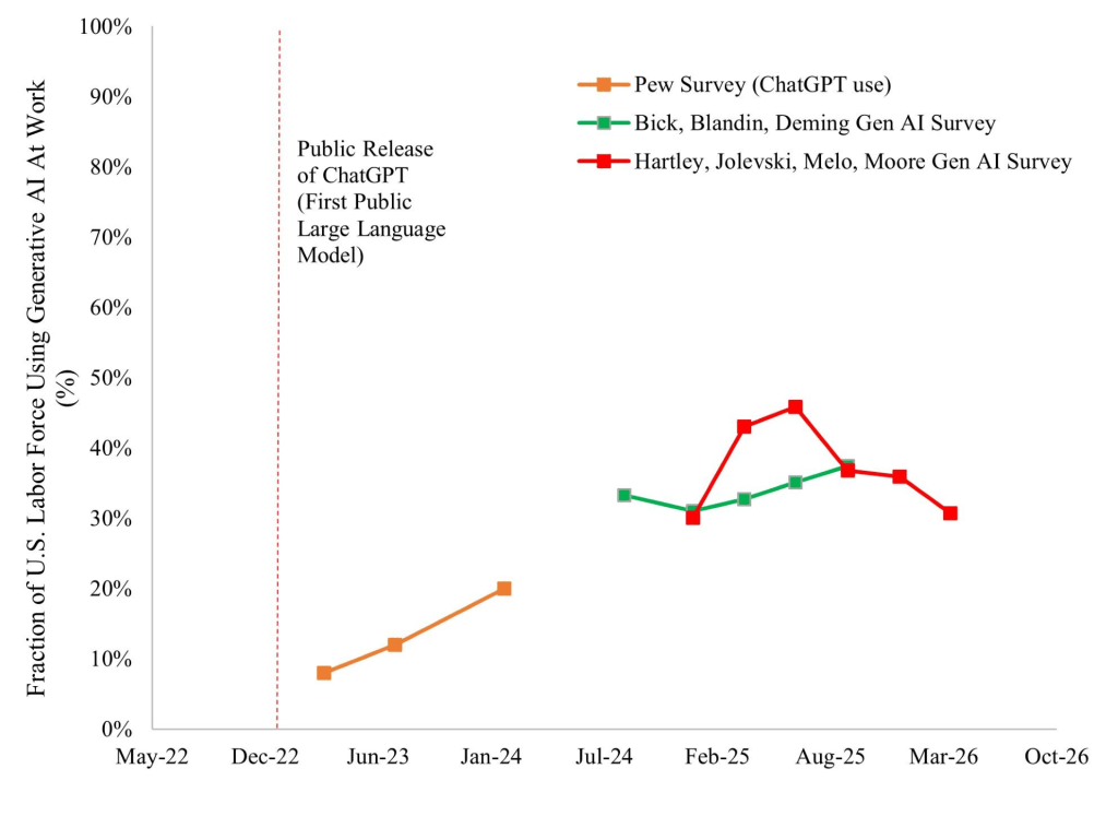 Overall, we find that LLM adoption at work among U.S. survey respondents above 18 has increased rapidly from 30.1% as of December 2024, to 43.2% as of March/April 2025, and to 45.9% as of June/July 2025 (Figure 2).7. The 2025 surge in Generative AI use is consistent with a 2025 surge in Google search volume for “ChatGPT” (Figure 15) and a 2025 surge in the overall share of U.S. businesses with paid subscriptions to AI models, platforms, and tools tracked by Ramp (Figure 19).